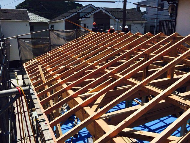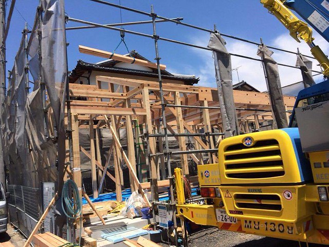 次から次へと柱が運ばれて家の輪郭が現れて行きます。今から完成が楽しみです。